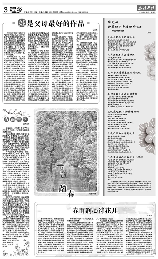 雨还在下,淅淅沥沥。我撑着雨伞走出家门,和着绵绵细雨的节拍,不徐不疾,沿着山边大道信步而行。习习春风吹拂着我的脸庞,让人心旷神怡。被雨水洗涤过的大地景色艳丽,空气清新。路旁的紫荆花越发妩媚,动感的花朵在摇曳生姿。山边一些不知名的野花在绽放,色彩斑斓,焕发着勃勃生机。不远处,有几个游人用手机在拍摄桃花,时不时还传来开心的笑声。