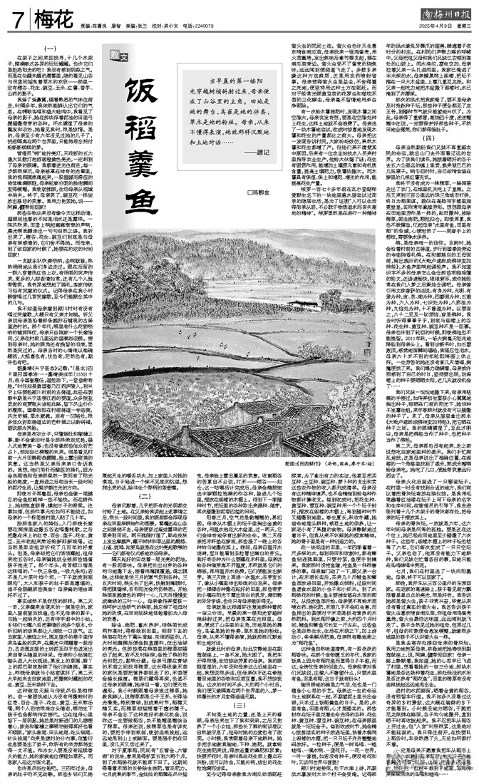 我终于没有成为一株稗草,一路闯荡走出了农门,在城里机关吃上了皇粮。之后又来到三百公里远的珠三角城市打拼,终日为稻粱谋。貌似在高档写字楼里冠冕堂皇,实则常年案牍劳形。想想跟母亲在田地里劳作是一样的,耘田撒种,拔除稗草,驱虫施肥,颗粒归仓。即使再累,我也不敢懈怠,忆起母亲“水里有鱼,田里有稻”的告诫,心便坦然了——观音手上的柳枝,需要净水供养。