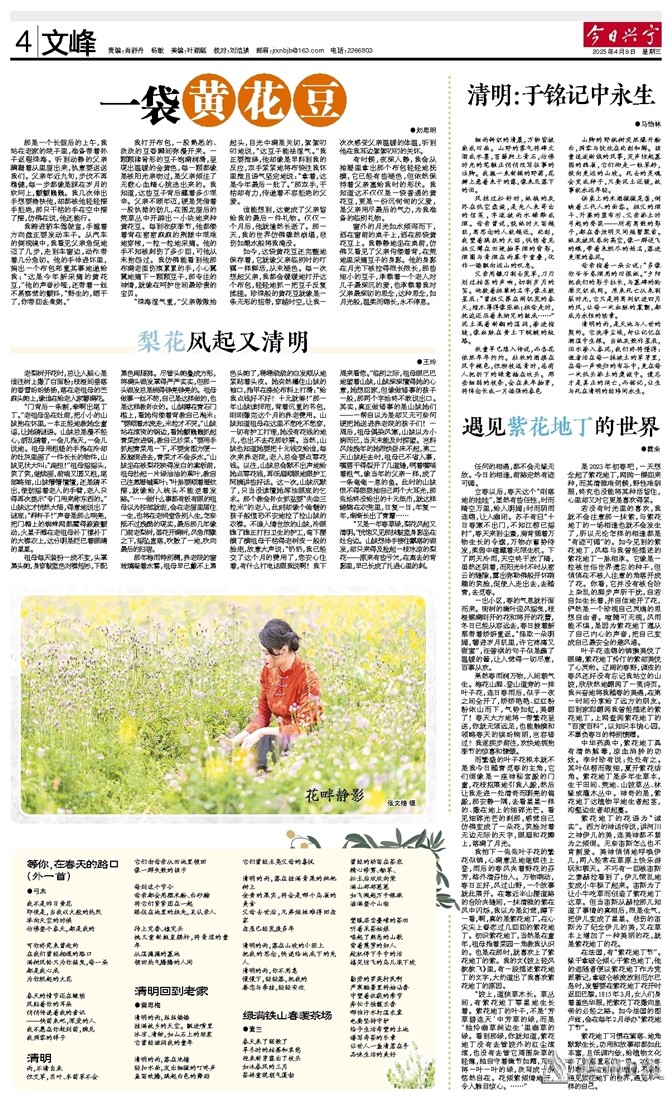 “坡上,道狭草木长。草丛间,有紫花地丁零星地生长着。紫花地丁的叶子,不是‘芳草碧连天’中芳草的绿,而是‘独怜幽草涧边生’里幽草的绿。看到那绿,你就知道,紫花地丁没有去管坡外的红尘滚滚,也没有去管它周围杂草的轻薄,独自守着嫩节如霜,兀自将一叶一叶的绿,淡写成一份悠然自在。花倾紫倾情地开,令人触目惊心。……”