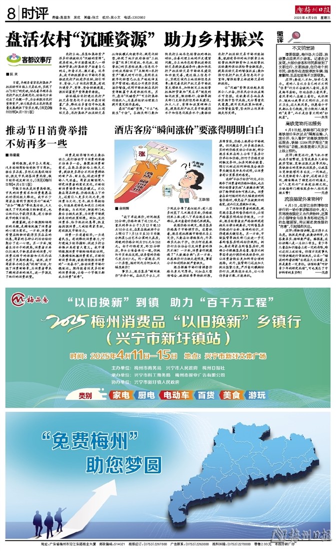 清明假期,我市各大商超、汽车经销商纷纷抢抓节日商机,推出多品类、多形式优惠促销活动,激发市民游客消费热情,假日经济迸发新活力。(详见《梅州日报》4月6日1版)