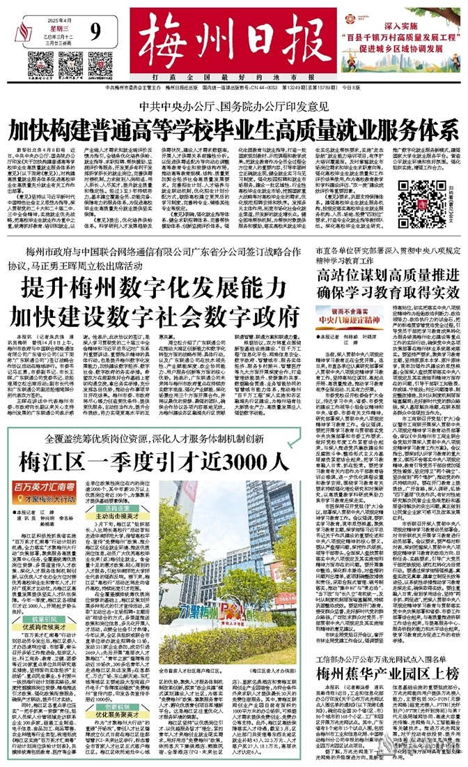 根据协议,双方将重点围绕新型基础设施建设、“百千万工程”信息化平台、网络信息安全、数字政府、智慧城市、服务实体经济、服务乡村振兴、智慧医疗等九大方面开展深度合作,打造管理效能提升、资源集约共享、数据融会贯通、业务智能协同的智慧城市能力体系,推动梅州“百千万工程”深入实施和苏区融湾先行区建设,为梅州培育壮大新质生产力、高质量发展注入强劲数字动能。