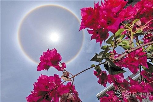 当日11时至12时左右,不少市民抬头发现,一个以太阳为中心的巨大彩色圆环高高悬挂在苍穹中,呈现出红、橙、黄、绿等多种绚丽颜色,蔚为壮观。