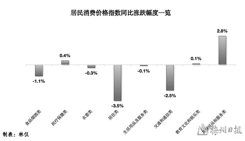 分类别看,CPI八大类商品(服务)价格同比呈“3涨5降”态势。其中,其他用品及服务价格上涨2.8%,医疗保健价格上涨0.4%,教育文化娱乐价格上涨0.1%;居住价格下降3.5%,交通通信价格下降2.5%,食品烟酒价格下降1.1%,衣着价格下降0.3%,生活用品及服务价格下降0.1%。