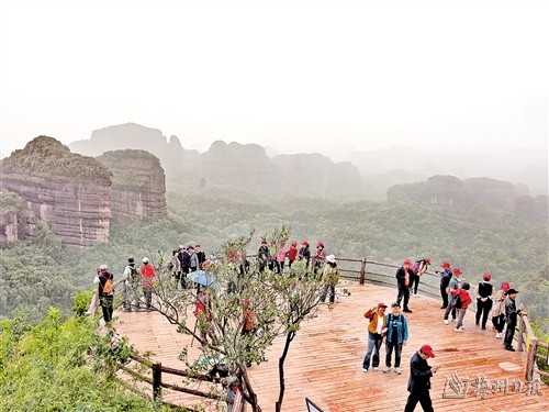 次日,天气晴朗,读者团成员们满怀期待地来到了丹霞山。一开始前往丹霞山长老峰景区,索道成了便捷的上山方式。透过缆车的窗户,丹霞山的壮丽景色逐渐在眼前铺展开来,宛如大自然精心雕琢的艺术品。当读者团成员登上长老峰山顶的那一刻,眼前连绵起伏的丹霞山峰美景,让所有的疲惫都烟消云散。在丹霞山游览阳元石,其独特的造型让人不禁感叹大自然的鬼斧神工。读者们纷纷驻足观赏,拍照留念,为这奇妙的景观所折服。