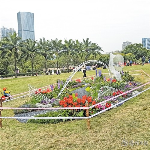 宽广的绿茵草地上热闹非凡,四角木凉亭里有些走累的游人在聊天说笑,更多的市民在花丛欣赏和拍照,喝彩赞叹声不绝于耳。我走近一看,原来草地上有许多造型不同的花卉景点,旁边还竖立起一个透明的牌子,上面写着:粤港澳大湾区花园大赛。不同造型的艳丽鲜花,引来了市民驻足观赏,好多游客还不断地摆弄各种姿势拍照留影呢!