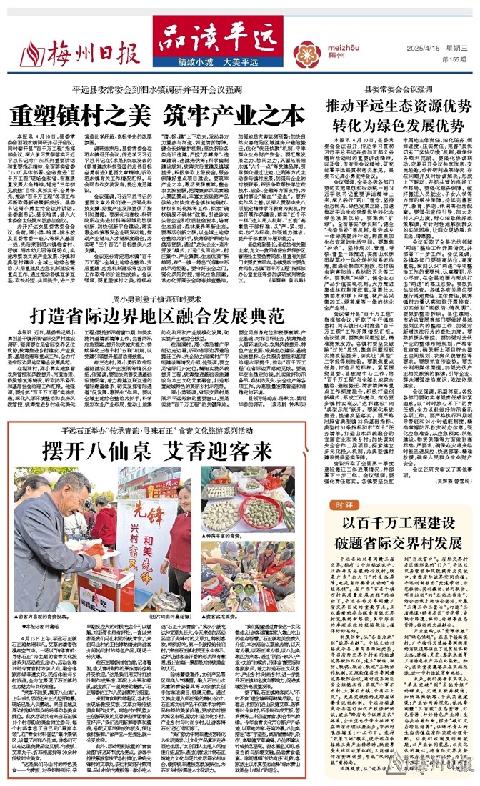 4月13日上午,平远石正镇石正湾热闹非凡,艾草的清香弥漫在空气中。一场以“传承青韵·寻味石正”为主题的食青文化旅游系列活动在此举办,活动以春日时令青食材为切入点,融合客家炒绿非遗文化、民俗体验与乡村旅游,全方位展现了石正镇的生态魅力与文化底蕴。