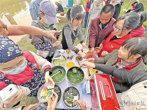 来到青食制作体验区,各村妇女现场教授艾粄、艾草丸等传统美食制作技艺。南台村村民蓝女士创新研发的艾香笋菇青团粄备受好评,“我们选用新鲜春笋和蘑菇,搭配艾草汁做成的粄皮,保证食材新鲜。”该产品一经推出就十分受欢迎。