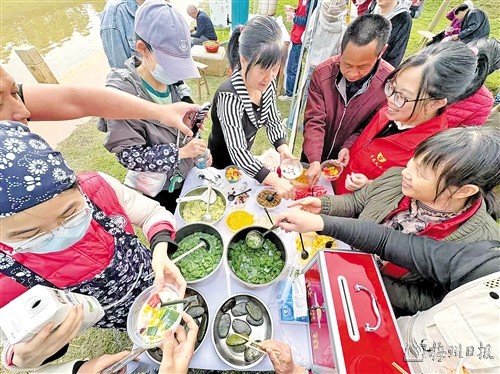 在青食制作体验区,各村妇女现场教授艾粄、艾叶丸等传统美食制作技艺。南台村村民蓝女士创新研发的艾香笋菇青团粄备受好评。“我们选用新鲜春笋和蘑菇,用艾叶汁做成粄皮,食材新鲜。”蓝女士说,该产品一经推出就十分受欢迎。