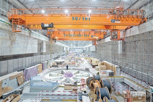 充水系统建成并试验成功后,电站二期项目团队集中资源力量,全力加快推进机电设备安装工作,为项目加快建成投产创造有利时机。在地下厂房,只见二期项目4台机组“一字”排开,大型吊机来回吊装零部件,工人们有序分工安装机组,现场一派繁忙景象。