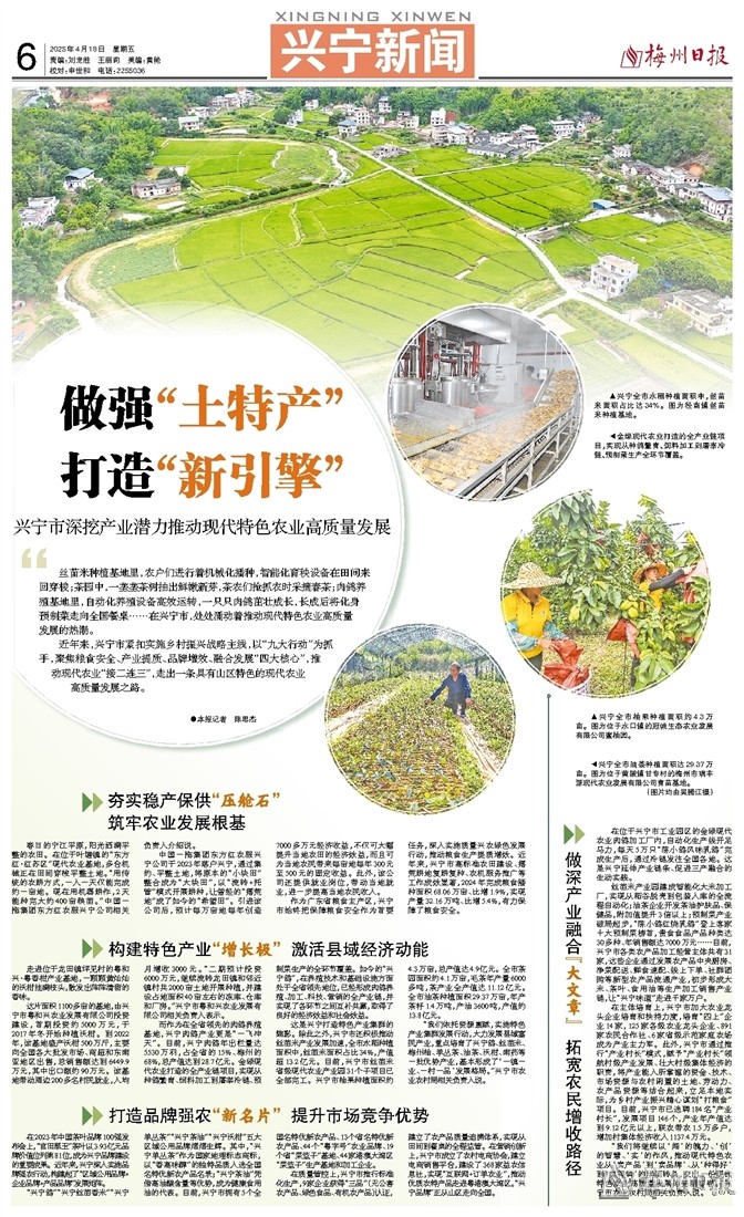 近年来,兴宁市紧扣实施乡村振兴战略主线,以“九大行动”为抓手,聚焦粮食安全、产业提质、品牌增效、融合发展“四大核心”,推动现代农业“接二连三”,走出一条具有山区特色的现代农业高质量发展之路。