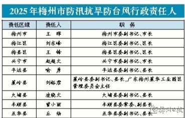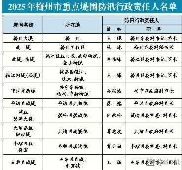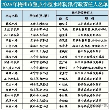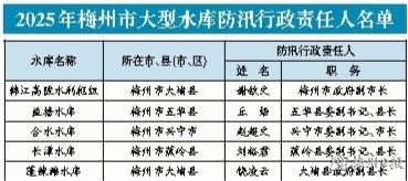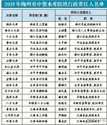 为切实做好2025年我市三防各项工作,进一步强化三防责任落实,根据《中华人民共和国防洪法》《中华人民共和国防汛条例》《中华人民共和国抗旱条例》《广东省防汛防旱防风条例》有关规定,现将我市2025年市、县三防行政责任人和大中型水库、重点堤围、重点小型水库防汛行政责任人名单在梅州日报向社会公布,请各级行政责任人及时上岗到位,切实履行职责,组织落实各项防汛防旱防风措施,最大限度降低灾害风险,全力以赴保障人民群众生命财产安全。