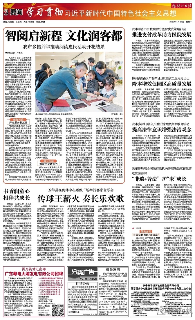 “我是老读者,经历了从传统借阅卡到‘刷脸’借书的借阅体验。如今,全市图书‘通借通还’,小朋友不仅可以在图书馆借阅书籍,而且还可以依托‘数阅梅州’小程序在线听故事,资源很丰富,操作很便利!”提起我市的数字化、智慧化阅读服务,市民朱晓赞不绝口。