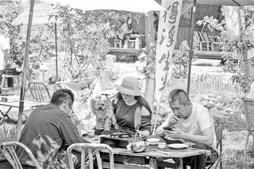 昨日,在张夏街道岳庄村,游客在一处休闲庭院内休闲娱乐。