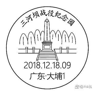 2018年12月18日,梅州市首个红色主题邮局——“三河坝战役纪念园红色主题邮局”挂牌成立,梅州邮政同日启用“三河坝战役纪念园”风景日戳。三河坝战役纪念园位于梅州市大埔县三河镇,原地邮局:大埔县三河邮政支局,邮编:514265。