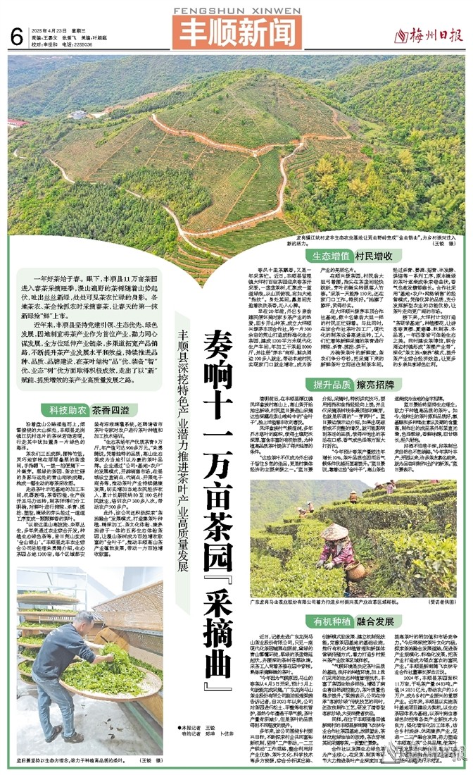 同样,在位于丰顺县潘田镇新南村的丰顺县新南腾飞农林专业合作社茶园基地,放眼望去,茶林泛起绿油油的波涛,茶农穿梭其间采摘春茶,一派繁忙景象。