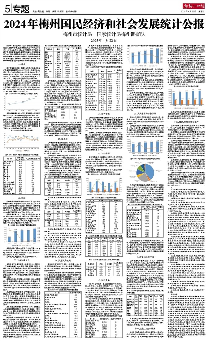 2024年,梅州坚持以习近平新时代中国特色社会主义思想为指导,全面贯彻党的二十大和二十届二中、三中全会精神,深入学习贯彻习近平总书记对广东系列重要讲话和重要指示精神,扎实落实省委“1310”具体部署和省委、省政府主要领导来梅调研指示精神,攻坚克难,砥砺奋进,经济运行稳中有进,经济总量迈上新台阶,发展动能不断积蓄,民生保障持续改善,全市经济社会发展取得新成效。
