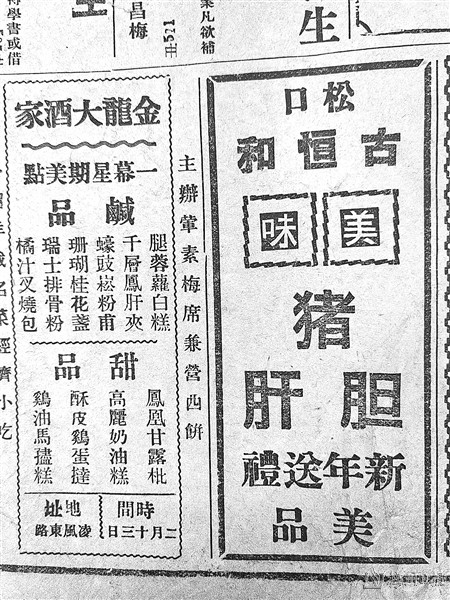 1938至1942年的《中山日报》梅县版,广告大部分是梅城以及松口等地的各大小酒家,排版密集,酒家名号琳琅满目,广告词精心设计朗朗上口。纷纷推介酒家地址、经营特色、餐厅环境、装修风格……当然最关键是要吸引读者的“胃口”:主打菜肴、时髦菜品、美点咸品、甜品、饮品……客粤潮三大菜系在这里呈现“广东全席”之势。除此之外,还有承办婚宴、生日宴、外宴等各种筵席、招聘名厨、侍应等启事,饮食业带动消费和就业。