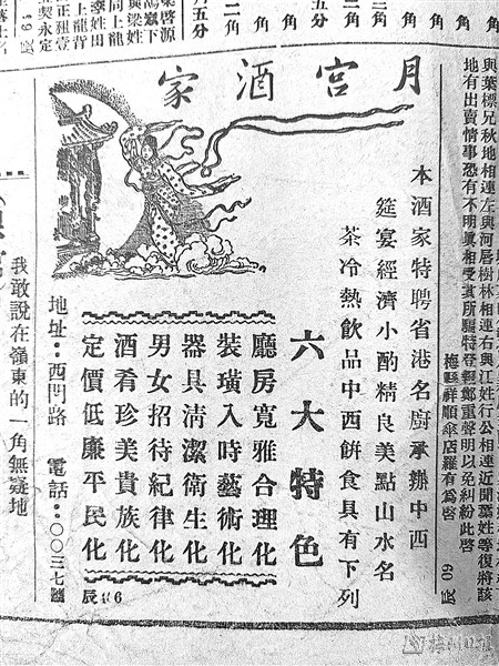 特聘省港名厨承办中西筵席。呈现“六化”:厢房宽雅合理化;装潢入时艺术化;器具清洁卫生化;男女招待纪律化;酒肴珍美贵族化;定价低廉平民化。