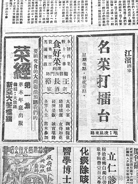 为招揽生意,众多酒家在《中山日报》梅县版刊登广告,展示营销策略,风头最劲的当属江滨酒家和新亚大餐楼。两家有打擂台争霸之势,长期在版面上反复较劲。从服务、装潢、价格、菜色等方面进行宣传,各显神通,噱头百出,以达到招揽顾客目的。