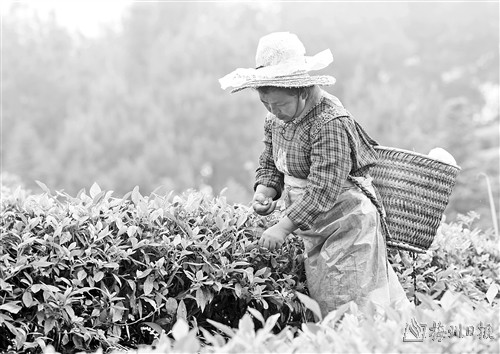 近日,在重庆市綦江区石角镇新农村,村民在茶园内采摘鲜茶叶。
