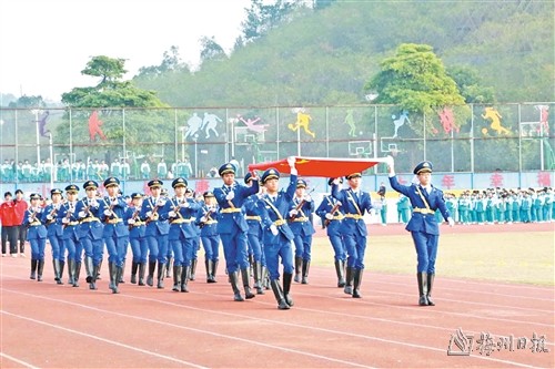 该校高度重视国防教育工作,将国防教育工作纳入学校重要议事日程和年度工作计划,并始终秉承着国防教育是全民国防教育的基础,是实施素质教育的重要内容,学生是国防建设的后备力量,着重培养国防后备力量建设。近年来,高级中学始终将国防教育作为立德树人的重要抓手,构建了“课程+实践+文化”三位一体的育人体系,成效显著,学校连续获得多项省级、国家级荣誉。2022年12月,学校获评“广东省国防教育特色学校”;2023年7月,学校代表队在广东省军事理论竞赛中荣获优秀奖;2024年5月,学校国旗护卫队在广东省国防教育成果展示活动中获得梅州选拔赛一等奖;2024年7月,学生魏展康代表梅州市参加广东省军事训练营竞赛,夺得团体一等奖;8月,魏展康代表广东省征战全国学生军事训练营,勇夺全国团体一等奖;2023届毕业生徐奕绅成功考入中国人民解放军空军航空大学。2024年秋季,学校高二年级开设“国防班”,遴选身体素质优异、成绩突出且立志报考军校的学生集中培养,不断为军校输送优质人才。