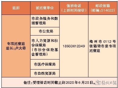 本次专项巡察时间为4月下旬至6月下旬。其间,市委专项巡察组设立专门联系电话和信箱,主要受理反映涉及政务服务工作方面问题的来信来电来访。受理信访时间截止到2025年6月25日。