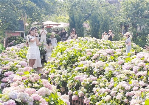 在梅江区爱丽丝庄园,上万株绣球花肆意绽放,成了一片五彩斑斓的花海,宛如现实版的莫奈花园,吸引不少市民和游客前来打卡、拍照。游客们漫步在庄园林间小道,尽情欣赏烂漫花海和各式绿植、大口呼吸清新空气。据介绍,除了赏花,该景区还设有捕鱼、赶海以及无动力乐园等丰富多彩的游玩项目,让不同年龄段的游客都能找到属于自己的乐趣。“我们精心布置了‘绣球花主题’观赏游玩项目,让市民和游客亲近自然,亲近美好。”梅江区爱丽丝庄园相关负责人杨国运表示,项目一经推出,便得到众多年轻人的热捧,“五一”假期首日便吸引3000多人进园游玩。