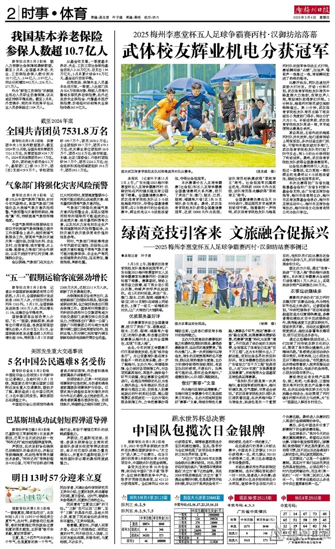 本报讯 (记者叶子通)5月3日上午,广东长隆2025梅州李惠堂杯五人足球争霸赛丙村·汉御坊站在丙村镇长隆足球公园落下帷幕。全国邀请赛决赛中,武汉体育学院校友队以3∶0战胜梅县丙村队,夺得全国邀请赛冠军;在2日晚举行的社会组决赛中,辉业机电以4∶0战胜法誉信,夺得社会组冠军。