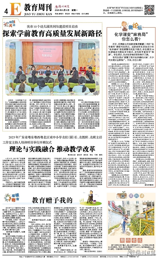 本报讯 (记者李盈子)近日,广东省高质量幼儿园共同体项目实施方案论证会先后在我市大埔县第二实验幼儿园、丰顺县留隍实验幼儿园、平远县实验幼儿园、梅县区实验幼儿园举行,标志着我市10个幼儿园共同体建设项目正式启动,梅州学前教育迈入“优质共享、协同发展”新阶段,为全省学前教育均衡发展探索实践路径。