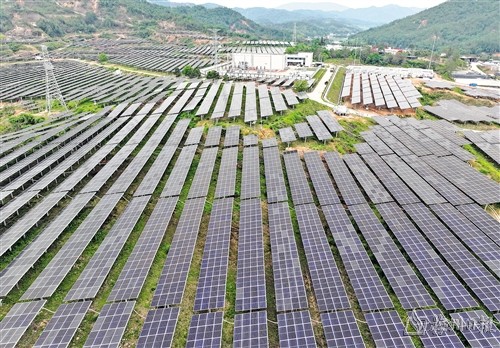 打桩、安装支架和光伏电池板组件、远程调试……近日,广东能源梅州平远光伏复合项目(一区)建设现场一派繁忙,一排排光伏板随着山势整齐铺开,仿佛给山体披上了一层“蓝色外衣”,工人们抢抓晴好天气,在各施工点位紧张有序作业。