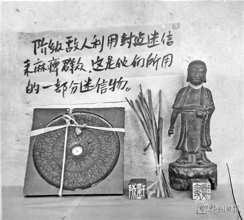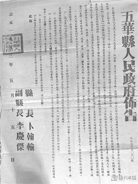 封建会道门是旧中国遗留下来的群众封建迷信组织。民国时期,五华县境域内普遍存在反动会道门组织设坛布道。其首要分子长期勾结日伪政权、国民党特务及外国势力,持续实施叛国祸民之非法活动。新中国刚刚成立之时,反动会道门组织由公开转为秘密,广泛流行于五华各乡村民间,改名换姓,继续危害全县人民。1953年4月,五华县取缔反动会道门的运动正式拉开帷幕,截至1953年8月,五华县全面实现“道坛清零、道首归案、道众转化”三大目标,彻底涤荡了旧社会留下的污泥浊水,为社会铲除了封建毒瘤,社会风气焕然一新。