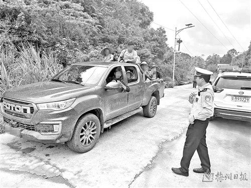 本报讯 (记者陈坚平 通讯员梅交宣)近日,梅县交警在梅县区石扇镇加庄村路段巡查时,发现一辆轻型多用途货车货厢上违法载人。民警随即示意驾驶员靠边停车接受检查。经查,该车核载5人,实载16人,其中有10名人员站在货厢上。