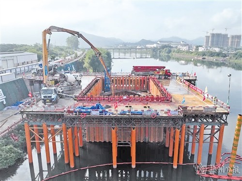 据了解,武梅石窟河特大桥位于梅县区丙村镇,全长1383.8米,主跨136米跨越石窟河主航道,是全线重难点控制性工程。作为大桥主跨刚构连续梁的核心支撑,21号、22号墩均位于石窟河主河道内,施工面临航道协调、水流冲刷及复杂地质等多重挑战。承台尺寸为16.5米×12米×3.6米,需浇筑混凝土712.8立方米,属全线规模最大的连续梁承台。为此,项目团队采用“先桩后堰”工艺,通过搭设钻孔平台完成桩基施工后,再构筑围堰进行承台作业,有效克服河道施工空间受限、水位变化等难题。