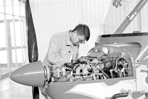 在辽宁省法库县辽宁众智益昇航空飞行学院,机务人员在检修飞机。