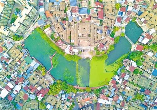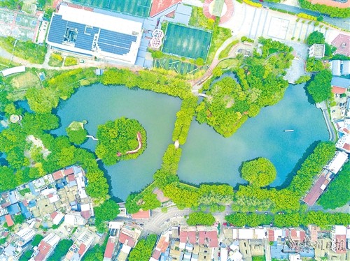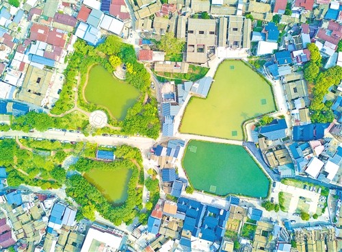 在梅江区西郊街道月影塘,几口池塘相邻,宛如蝴蝶翅膀,双翼对称舒展,在阳光下泛着粼粼波光,仿佛即将振翅翱翔。这片浑然天成的水域,曾一度沉寂,如今通过生态修复工程焕发新生。它不仅成了居民休闲的生态廊道,更以独特的形态诉说着人与自然和谐共生的绿色发展理念。岸边绿植摇曳,古民居枕水而立,白墙黛瓦的倒影在池塘中随波轻漾,正是绿美生态建设的鲜活答卷。