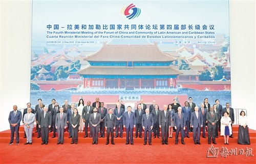 初夏时节,生机盎然。国家会议中心内,中国、拉美和加勒比国家国旗以及有关地区组织旗帜交相辉映。