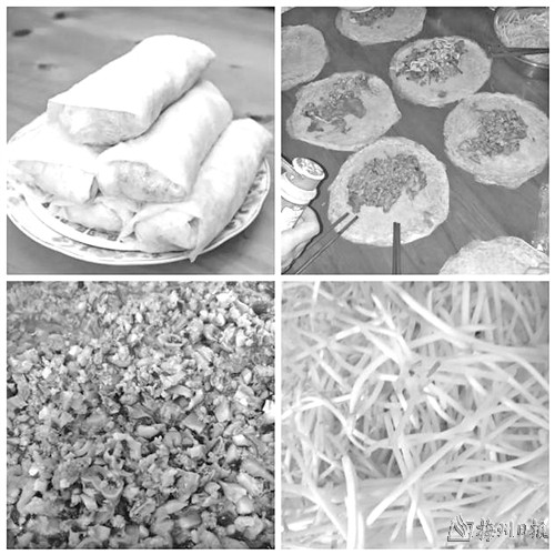 记得父亲头天在食肆订下薄饼皮,第二天一早便去市场采购食材。刚出炉的豆腐干闻起来要有纯正的豆香,随便翻动也不易断裂才是上品。绿豆芽要选水灵灵白嫩嫩根部不发黑的。香菜(芫荽)当然要鲜翠柔嫩,搭配起来才够出色。猪肉则要肥瘦正好的“前上肉”,那样的肉吃起来不柴。而虾仁、蚝豉、墨鱼、香菇,这些干货平时家里备有,泡软了切粒就能派上用场。