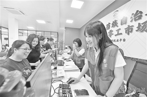 近年来,广西柳州市融水苗族自治县和对口帮扶的广东省廉江市依托粤桂劳务协作机制,不断加强零工市场服务体系建设,在多个易地扶贫安置小区和乡村,建立集就业登记、技能培训、岗位推荐等就业服务功能于一体的一站式服务中心,带动脱贫人口和易地扶贫搬迁劳动力实现就地就近灵活就业。(新华社发)