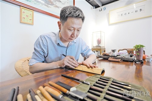 以刀为笔,在光滑平整的竹片上或刻上栩栩如生的各种图案,或刻上“姿态”各异的字体,再根据竹子的形态制成各类工艺品或生活用品,赋予竹子“二次生命”,使其同时具有书卷之气和金石味道。这便是梅县区非物质文化遗产代表性项目——岭南竹刻的魅力。