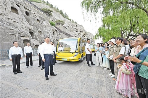 已有1500多年历史的龙门石窟,是重要的世界文化遗产。习近平来到这里,察看石窟整体布局风貌和代表性窟龛、造像,同现场的文物保护工作者亲切交流。他强调,要把这些中华文化瑰宝保护好、传承好、传播好。游客们见到总书记,都十分欣喜,纷纷向总书记问好。习近平不时同大家交流,特别鼓励小朋友们多到实地寻溯中华文化,从小树立文化自信。他指出,文旅融合前景广阔,要推动文旅产业高质量发展,真正打造成为支柱产业、民生产业、幸福产业。