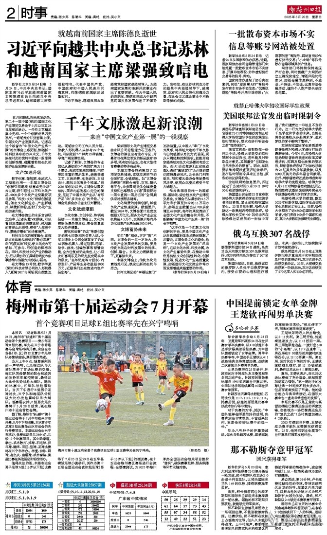 值得关注的是,本届市运会男子足球A组(16岁以下组)比赛将于7月25日至29日在五华县横陂足球小镇举行,其作为第十五届全国运动会竞体组足球(男子16岁以下组)的测试赛,在十五运会梅州赛区赛场进行全流程、全要素测试,为2025年梅州承办全国运动会相关项目提前“练兵”,确保赛事组织、服务保障等环节无缝对接。