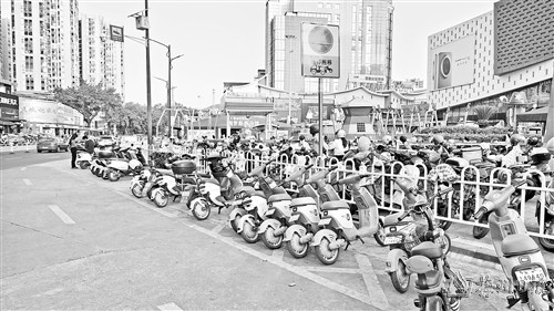 在坜明路,这一情况更为严重。因为道路临近商圈,停车点扎堆停放着共享单车。为了停车方便,好些共享单车被人为停放在机动车道上,有些甚至被停放在黄色网格线内。过往车辆不得不小心避让,导致交通通行效率下降,存在一定安全隐患。一名前来商圈购物的市民表示,这些乱停放的共享单车不仅让道路看起来十分杂乱,还让人很难找到广场的出入口。