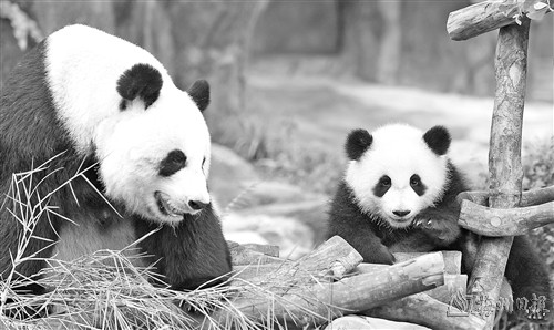 5月27日,在香港海洋公园“大熊猫之旅”展馆内,雌性大熊猫宝宝“加加”(右)与妈妈“盈盈”在一起。