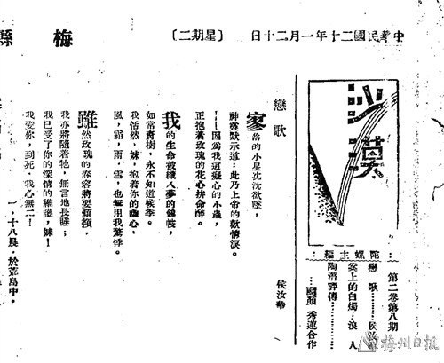 刘果因的回忆文章提到,“我和陈濂观,组织‘雪社’出版月刊时,是由英强、汝华负责诗歌,濂观负责小说,我则负责文艺评论”。抗日战争爆发后,广州等地相继沦陷,梅州地区成为华南抗日的大后方,广州的《中山日报》《建国日报》《中国诗坛》等报刊先后迁至梅州出版,在梅州掀起了抗战的爱国浪潮。“七星灯”文学社的成员参与了《中山日报》的办报工作,在《梅县民国日报》还专门开有副刊“七星灯”,黄伟强回忆道:“我们一般喜欢拿笔杆的同志们,差不多都在各报的副刊上占有地位了。”