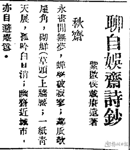 有意思的是,邵洵美用英文写过一篇文章《Poetry Chronicle(新诗历程)》,里面将侯汝华的一首诗《海上谣》翻译成英文,译为《Songon the Sea》,发表在1936年的英文月刊《天下》。诗译者为北京大学英籍教授艾克敦(Harold Acton)。