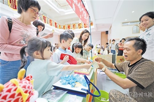 市剑英图书馆开展“粽享六一 童样精彩”主题游园活动,精心设置“童心画端午”团扇手绘、“书香古韵”雕版印刷体验、夹豆豆、运乒乓球绕障碍物、哪吒贴鼻子、套圈圈等传统非遗体验和趣味竞技游戏,让孩子们在欢声笑语中加深对优秀传统文化的理解与热爱。