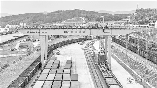 6月2日,中国铁路哈尔滨局集团有限公司绥芬河站集装箱换装场,回程中欧班列在进行换装作业(无人机照片)。