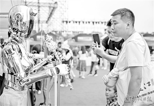 6月2日,在武汉市蔡甸区花博汇景区,游客观看机器人乐手。