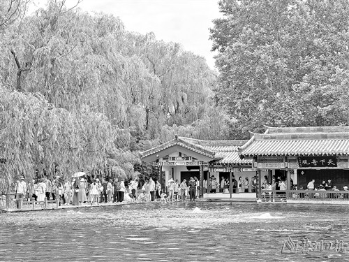 图为6月1日,在山东济南明水古城景区,游客在欣赏梅花泉。