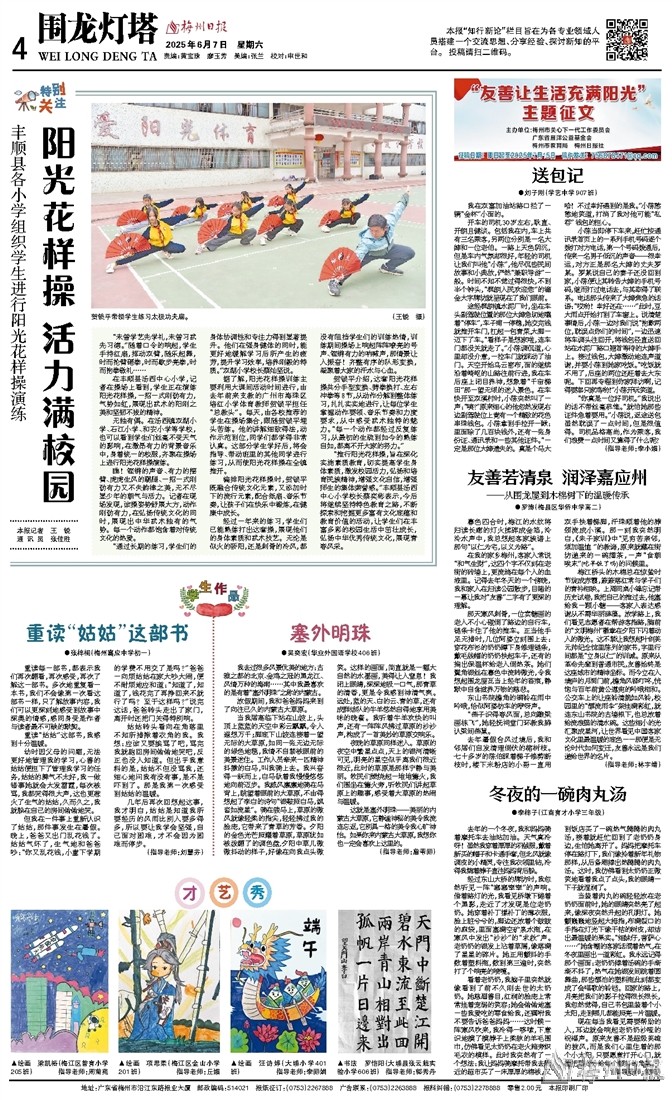 梅江桥头的木棉总在惊蛰时节绽成赤霞,簌簌落红常与学子们的青衿相映。上周同桌小锋忘记带历史试卷,我把自己的推过去,他塞给我一颗小糖——客家人表达感谢从不需华丽辞藻。放学路上,我们看见志愿者在帮游客指路,胸前的“文明梅州”徽章在夕阳下闪着动人的微光。这不禁让我想起叶剑英元帅纪念馆里陈列的家书,字里行间都是“立身以仁”的训诫。原来从革命先辈到普通市民,友善始终是这座城市的精神坐标。而今立在人境庐的月洞门前,檐角风铎叮咚,恍惚与百年前黄公遵宪的吟哦相和。公交车上的让座铃清脆如风铃,校园里的“漂流雨伞”架挂满彩虹,就连东山书院的古墙根下,也总放着给流浪猫的清水碗。这些细小的光汇聚成星河,让世界看见中国客家文化里最温暖的底色一一那便是无论时代如何变迁,友善永远是我们递给世界的名片。
